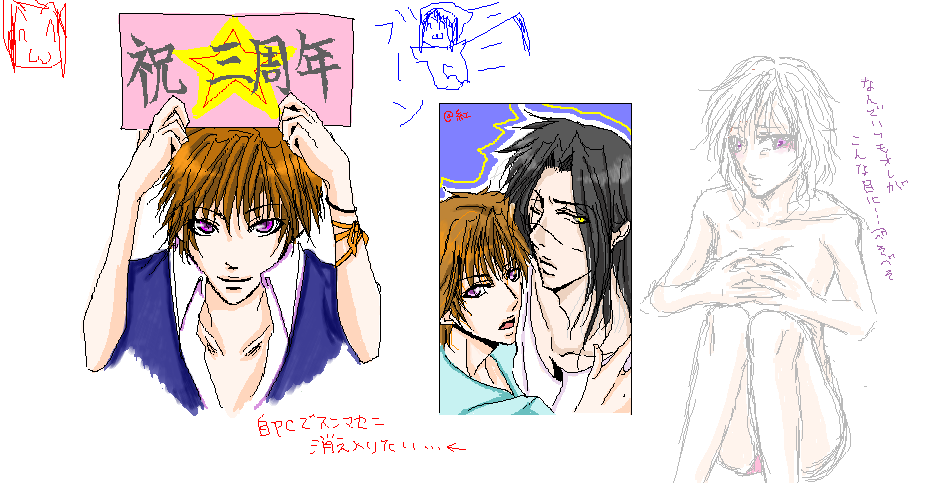 三周年ということで特に気にせずカズにプラカード持たせてみたんですがね…両脇がさくさんと魅沖さんによる素晴しい綾鷺会長とまりあちゃんで、しまったああああああNPC描けばよかったあああああ俺空気嫁えええええ!!!って消え入りたくなったんですけど(((